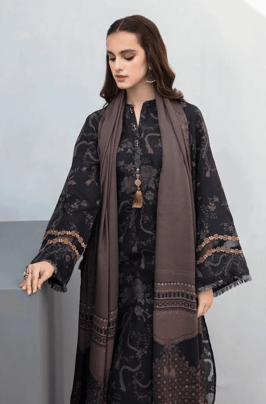 BK 201-3 Piece Unstitched Embroidered Khaddar Suit ( Printed Khaddar Dupatta )