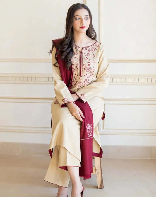 SN 61-3 Piece Embroidered Dhanak Shirt with Printed Wool Shawl